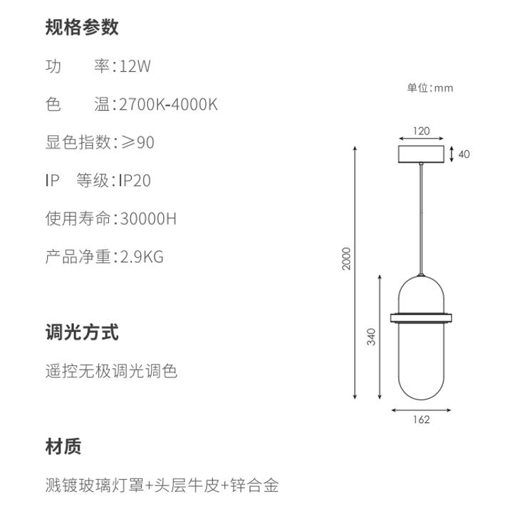 美时吊灯灵感源自早晨的光线,,,,穿透云雾渺渺的大气层洒到地上。。美时外层的玻璃自上而下从深色到透明的渐变镀层还原了这一情境,,,,光透过双层玻璃形成丰富的折射效果,,,,一如破晓时的光线充满朝气,,,采用上下两路光组合,,,,下路光直出提供主要光线,,,上路光提供氛围光。。上路光在手工吹制玻璃的不规则壁厚折射下,,,呈现了极其丰富的变化,,采用头层牛皮作为一个点缀,,,缓冲了玻璃与金属带来的冰冷和生硬的感觉,,取得了视觉的平衡。。